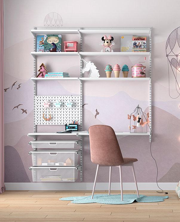 Модульная конструкция позволяет легко менять расположение полок, корзин и штанг, подстраивая их под рост и интересы — от хранения игрушек и книг до одежды и учебных принадлежностей.